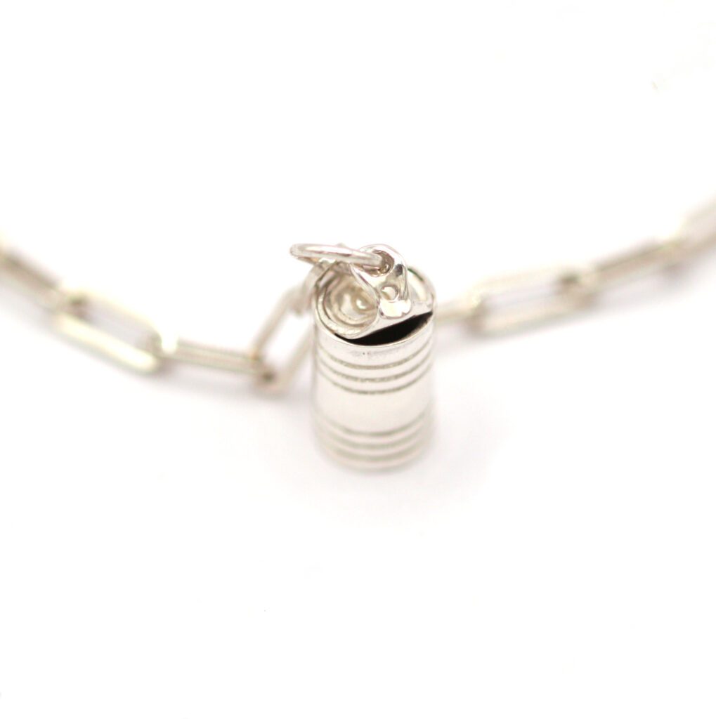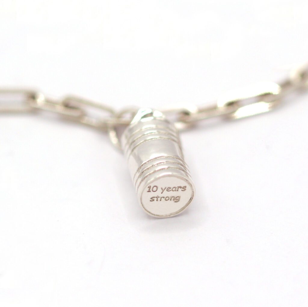 THE quirky and playful 10 year anniversary gift. Tin for ten years! Crafted in Sterling Silver with 10 Years Strong engraved on the bottom like a tin expiry date. Further personalise the charm by adding an engraving of your choice around the outside of the tin, perhaps your surname or a declaration of love :) This charm is a unique and symbolic way to celebrate 10 years together. Choose to buy it alone to add to an existing chain or contact me to add a bracelet or necklace. This piece is also available in Gold Vermeil and 9ct Solid Gold.