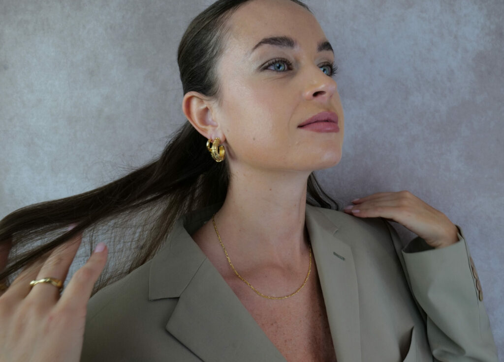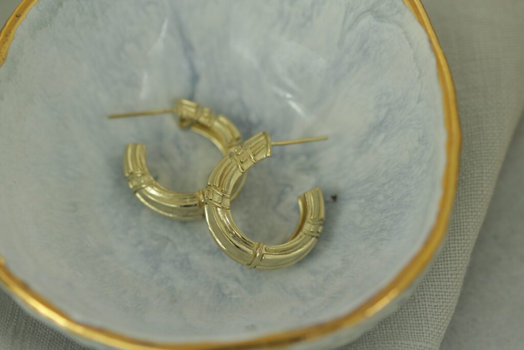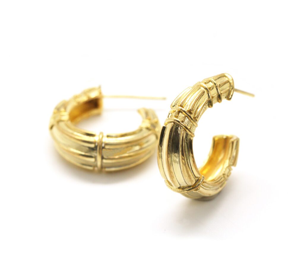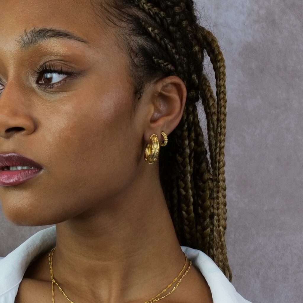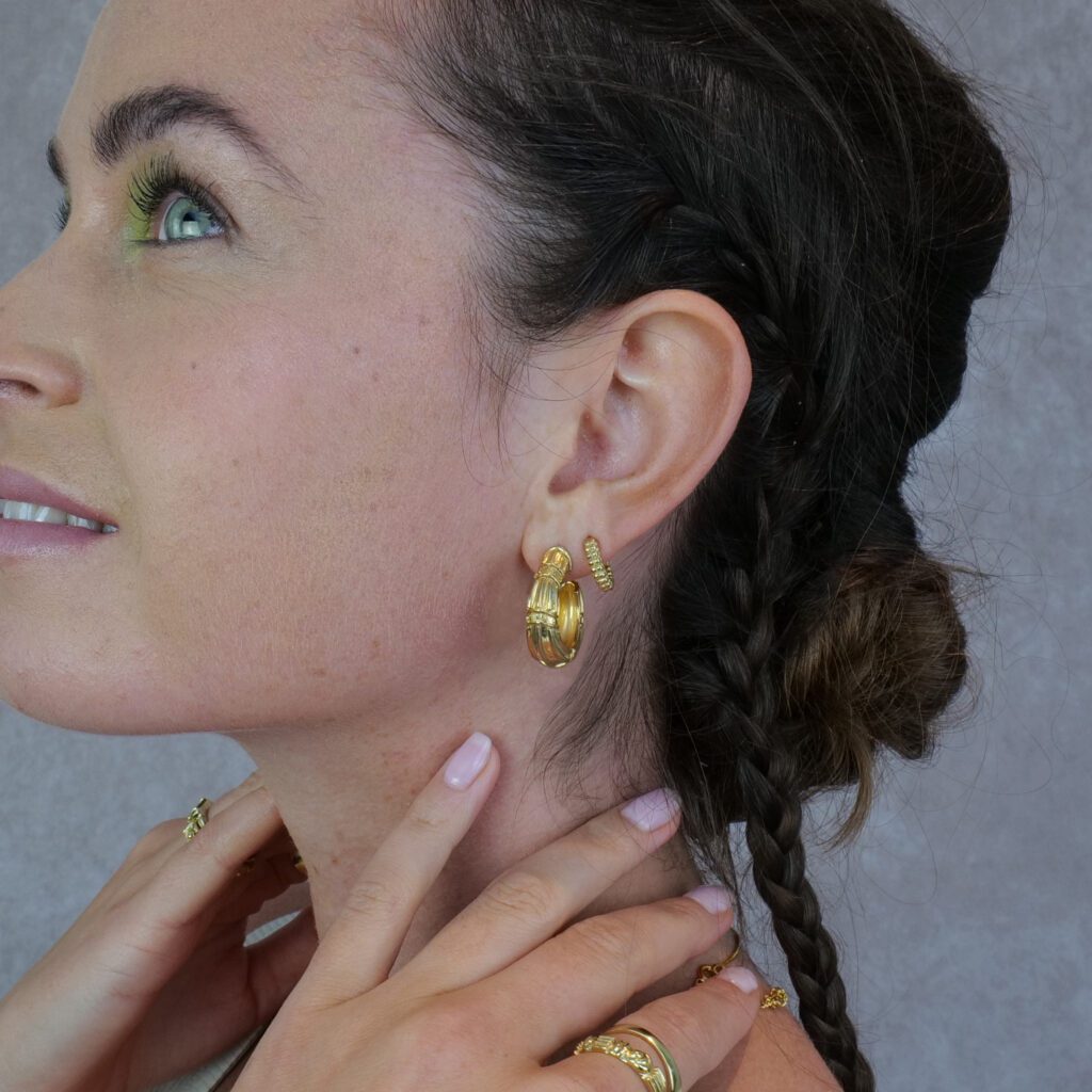 These bestselling chunky midi hoops are inspired by the protective armour of warriors. Also available in sterling silver and 9ct solid gold. Hoop dimensions – 24mm x 22xmm x 6-9mm.