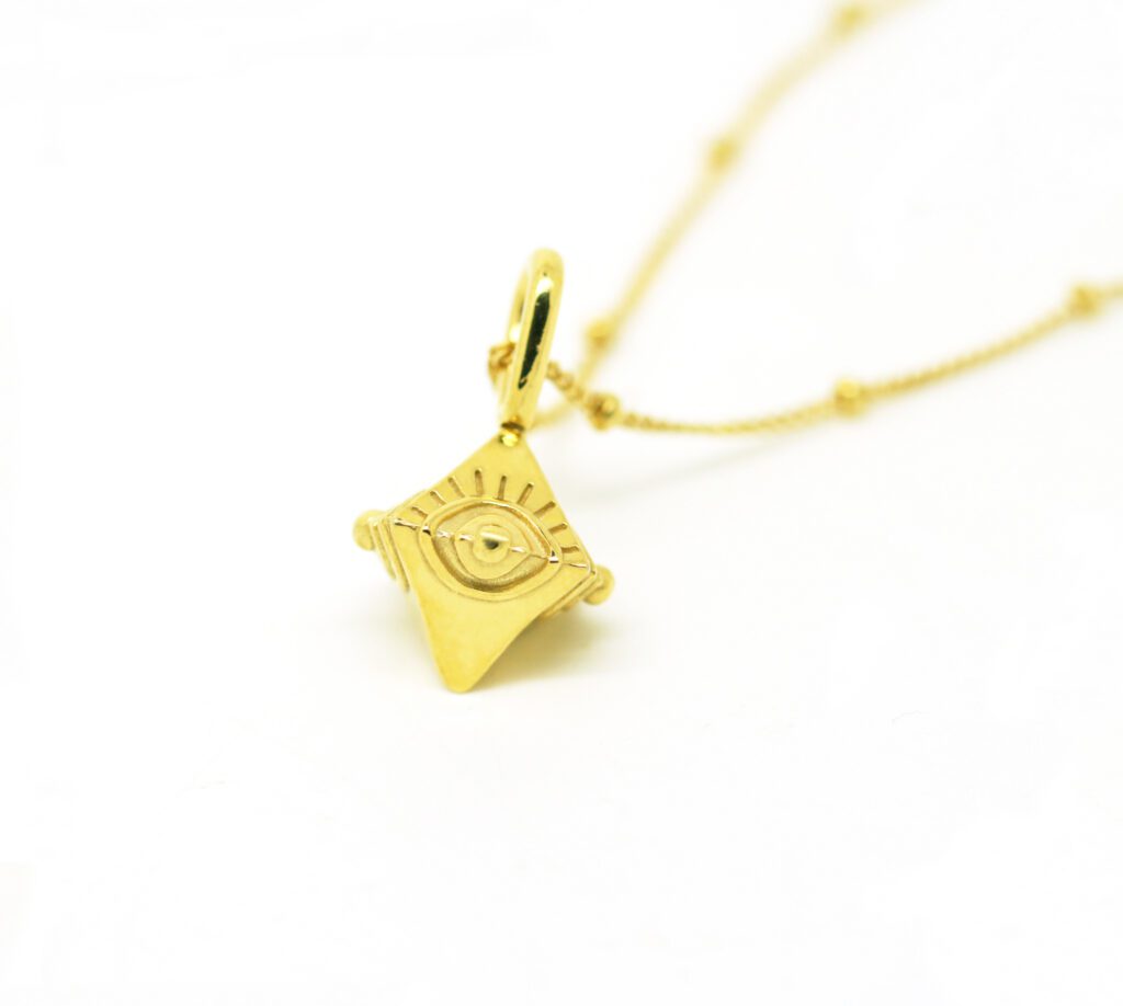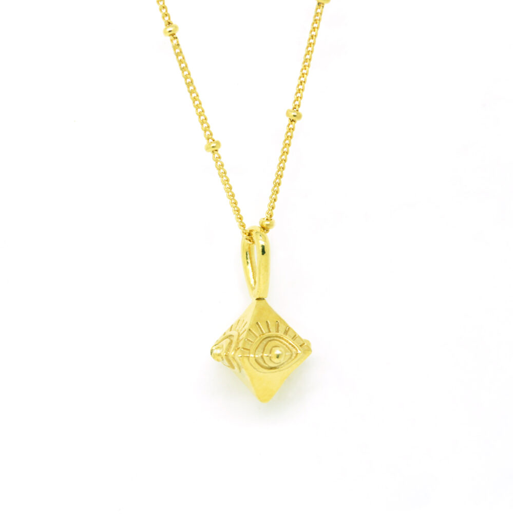 The wide awake necklace is an incredibly unique piece inspired by the ancient protective symbolism of the evil eye. This talisman sits on a stunning 24 inch satellite chain and will instantly draw everyone’s eye. Also available in sterling silver and 18ct gold vermeil. Pendant dimensions - 18mm x 13mm.