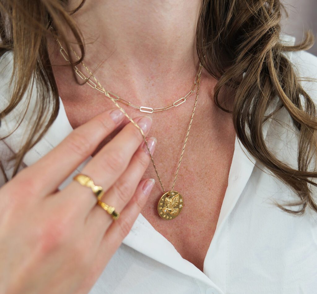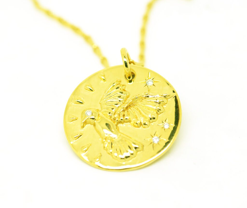 The Daydreamer Pendant is a statement piece inspired by the quiet beauty of classical coin reliefs and fossil forms found on windswept shores. At its heart, a bird caught mid-flight with a diamond eye and star-set diamonds scattered like constellations in the sky. This pendant symbolises freedom, hope, and the courage to dream. Engrave a name, a quote or a meaningful date on the back. Crafted to feel as meaningful as it looks, the pendant is both smooth and organically textured, resting with ease against bare skin or layered over your favourite knit. Available in 18ct gold vermeil and Sterling Silver and hanging on a stunning barley corn chain.