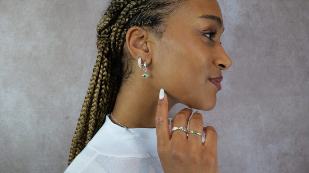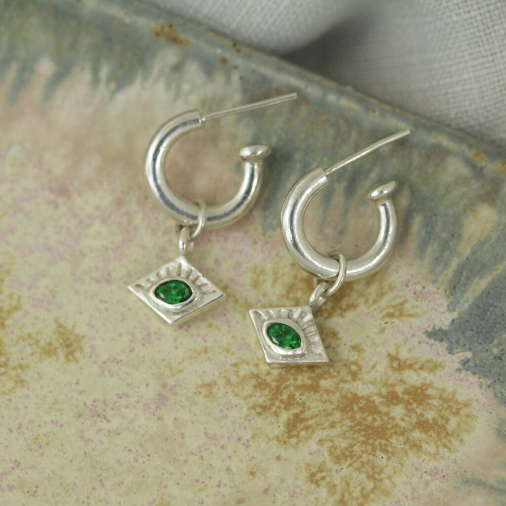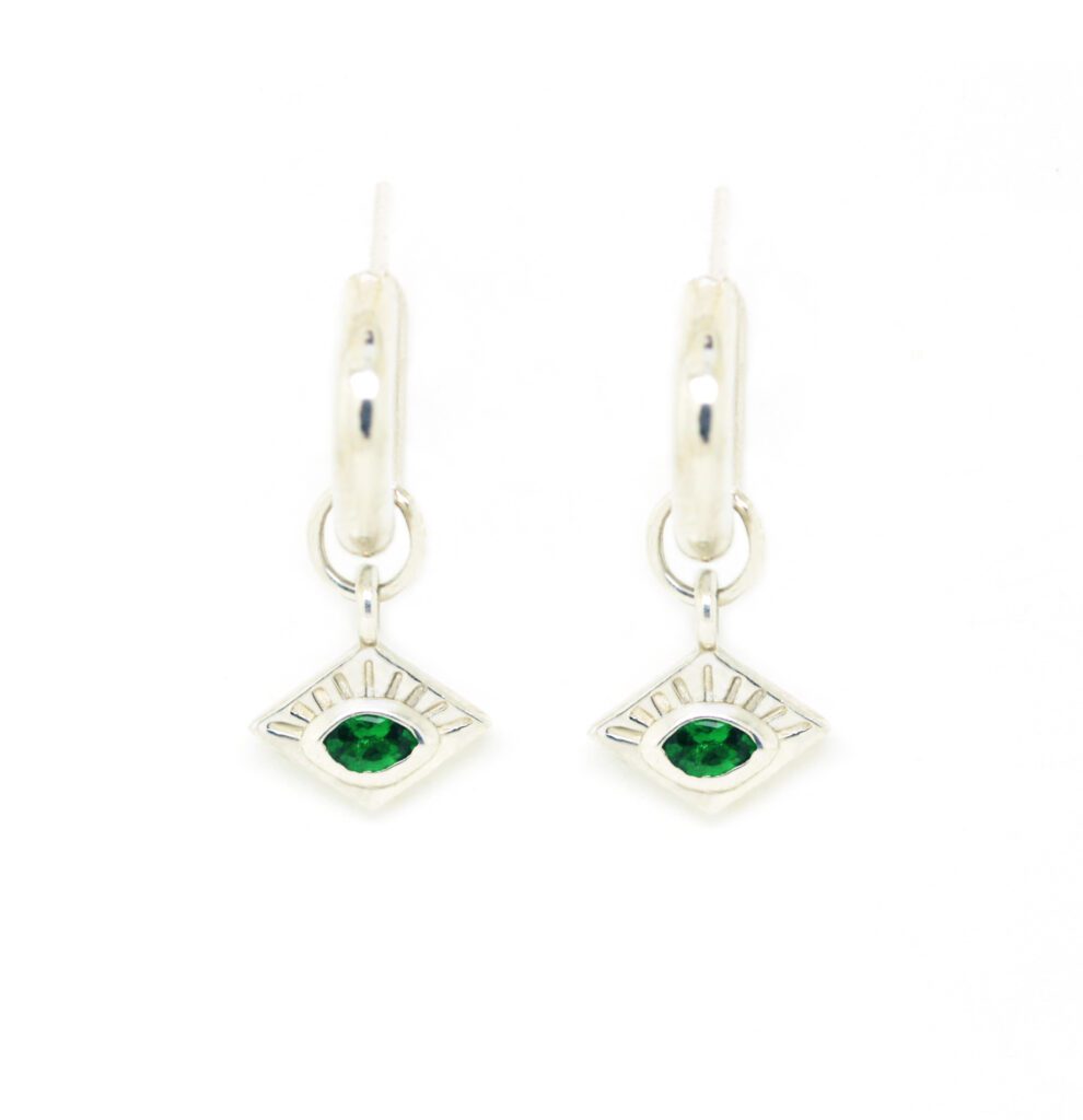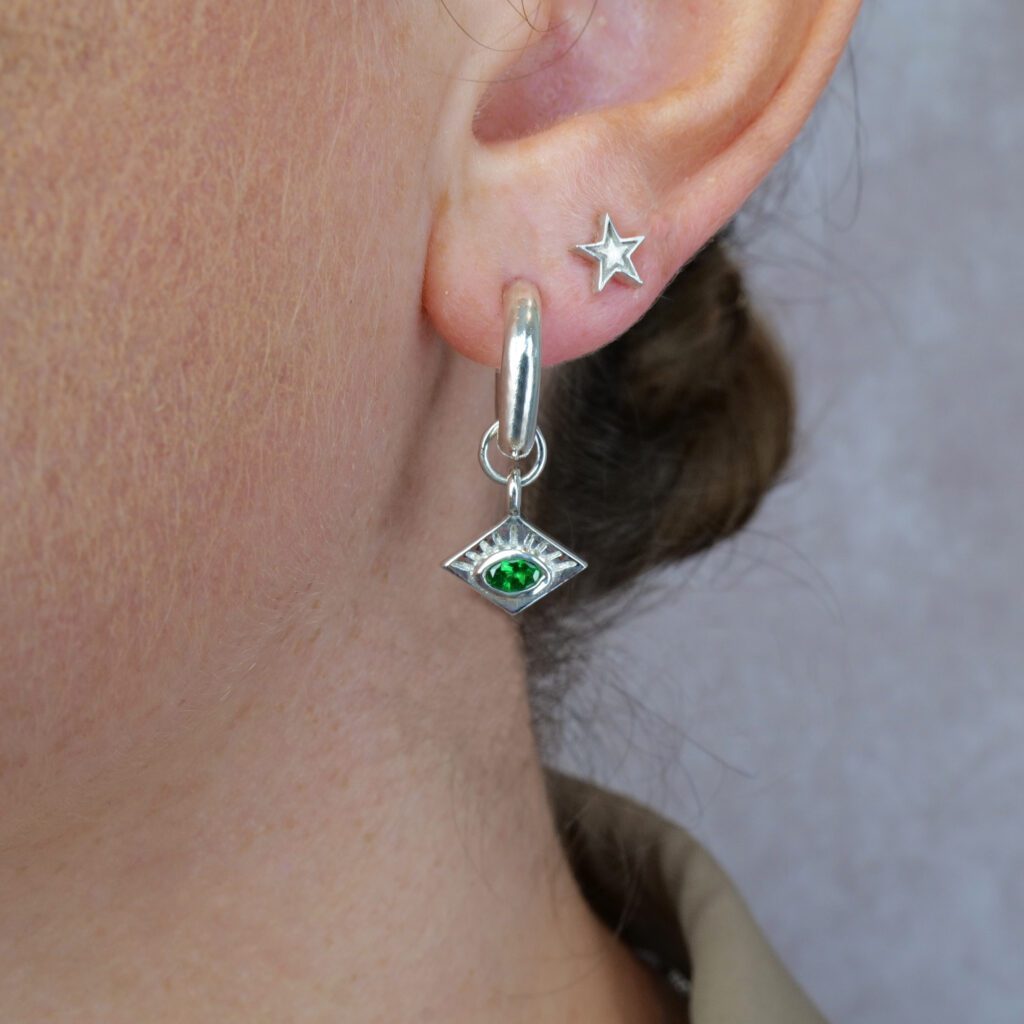 Meet your new everyday talisman: our green-eyed charm earrings. These hoops are adorned with shimmering evil eye charms, each set with captivating tourmaline gemstones. Beautifully symbolic and effortlessly stylish, they’re designed to protect—and to be noticed. Also available in 18ct gold vermeil and 9ct solid gold. Hoop dimensions – 23mm outside diameter. Charm dimensions – 11mm x 8mm