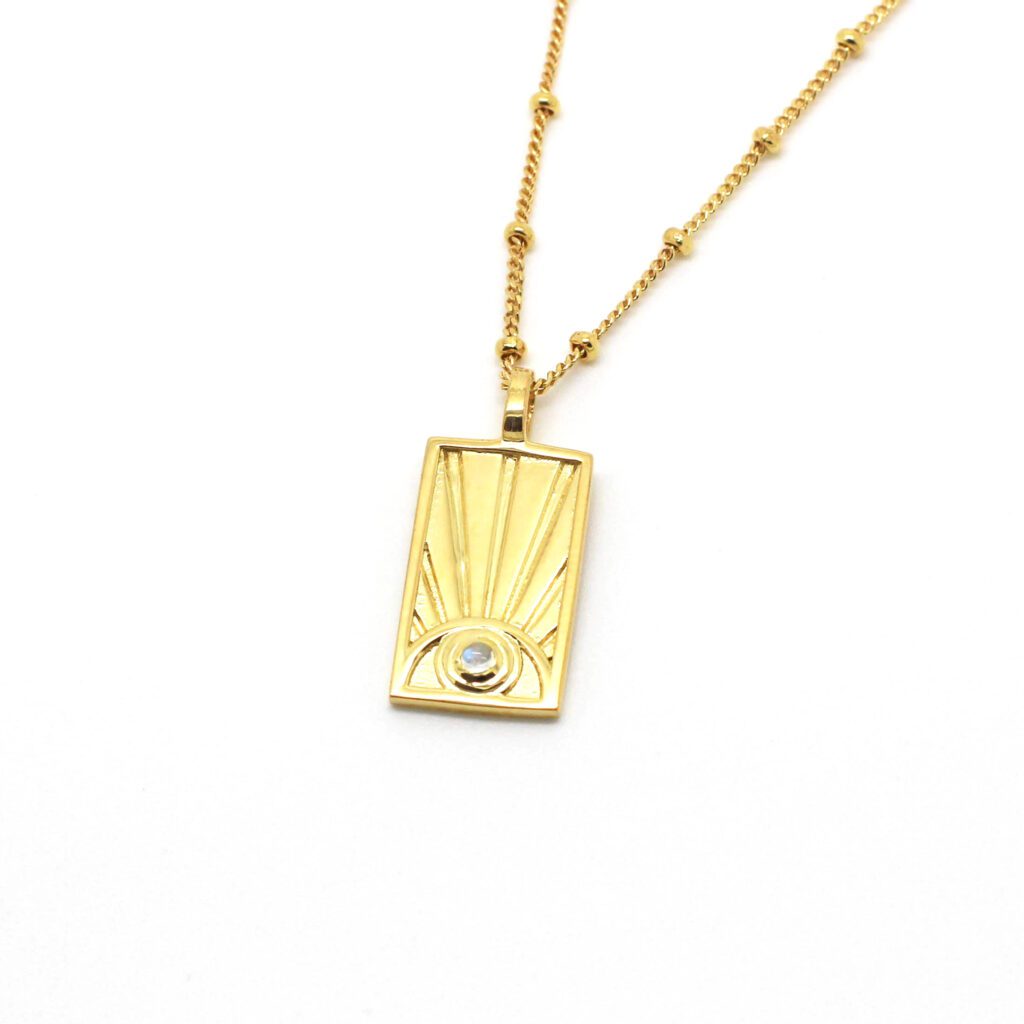 The Sun Rays necklace set with a moonstone on a stunning satellite chain. Also available in Sterling Silver and 9ct Solid Gold. The moonstone symbolises feminine "yin" energy, as well as love, hope, healing, and protection. Personalise your piece with an engraving on the back of the pendant. Pendant Dimensions - 18mm x 6mm. Chain length - 24 inches.