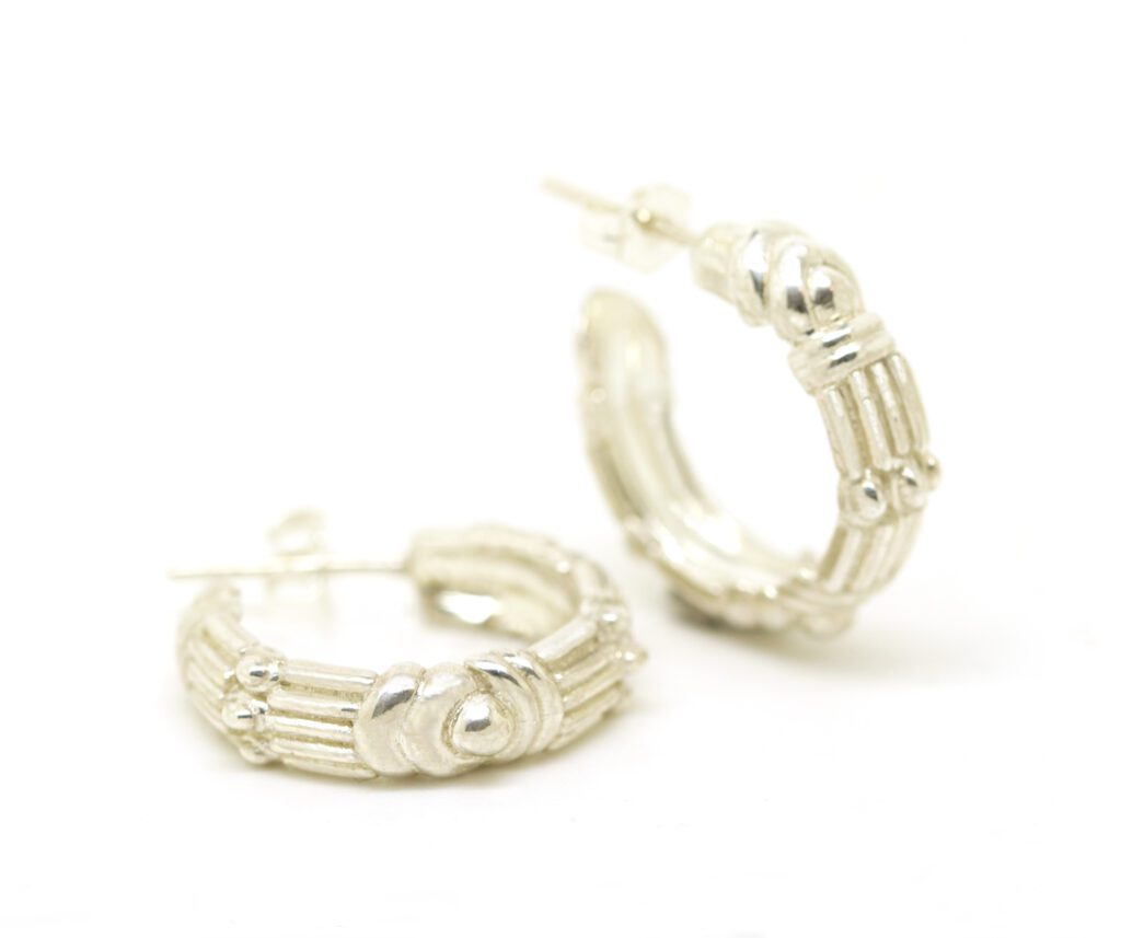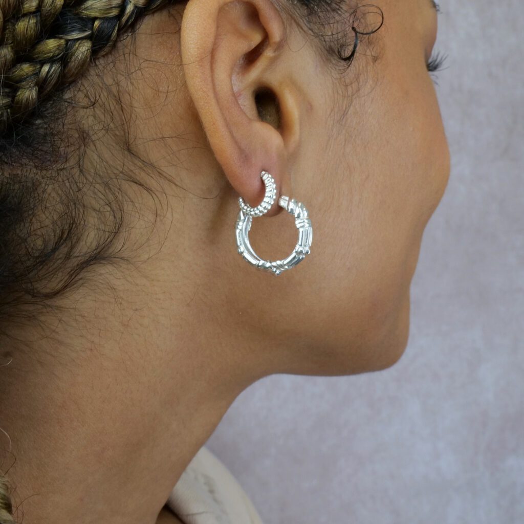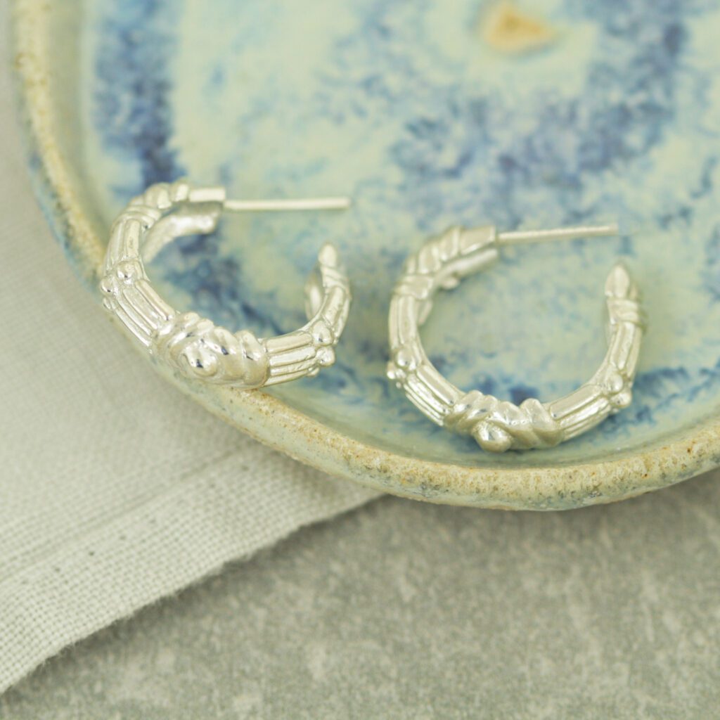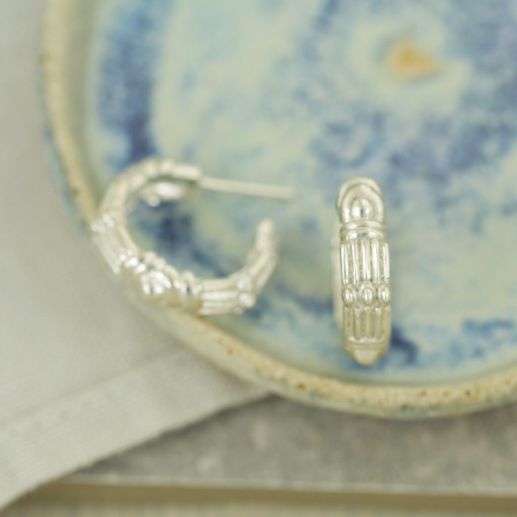 The unique midi hoops, inspired by the rich patterns of African baskets. Also available in sterling silver and 9ct solid gold.