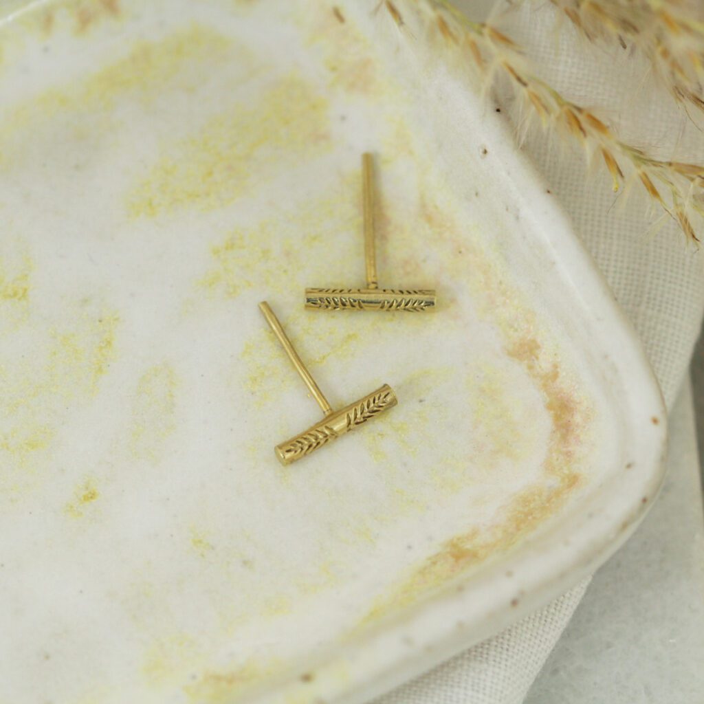 The T Bar stud, engraved with tropical ferns, the perfect ear accessory. Also available in sterling silver.