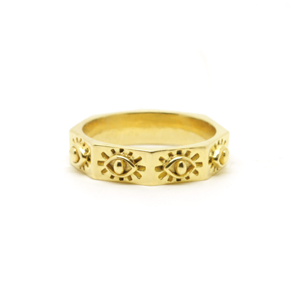 A stand out octagonal ring with the protective evil eye on each facet, this unique piece expresses the individuality of its wearer. Also available in sterling silver.