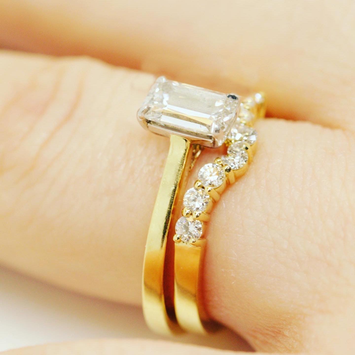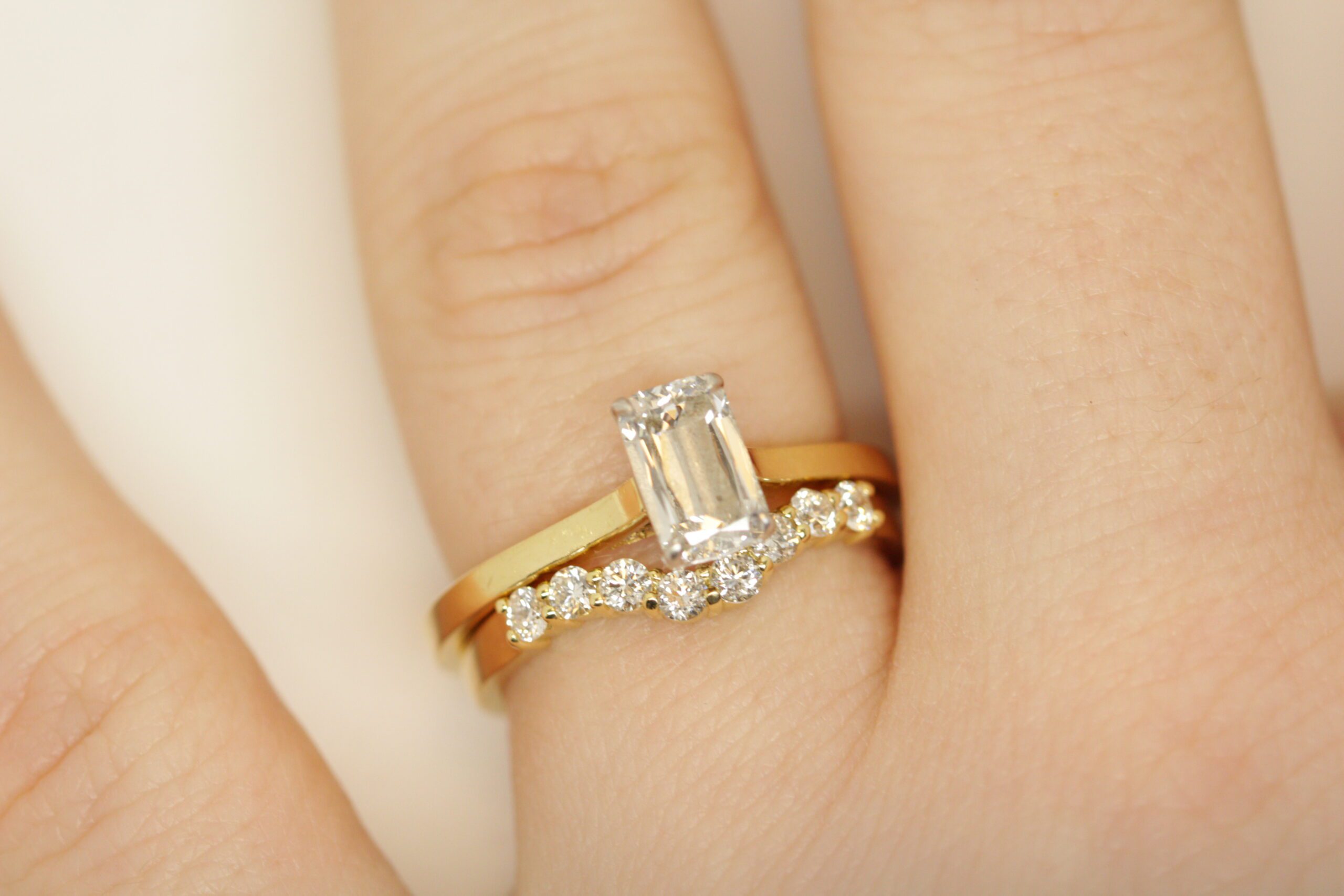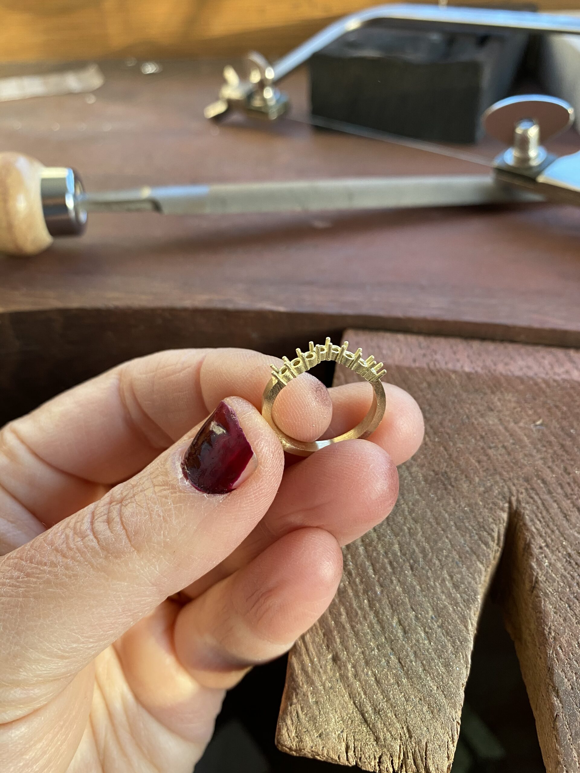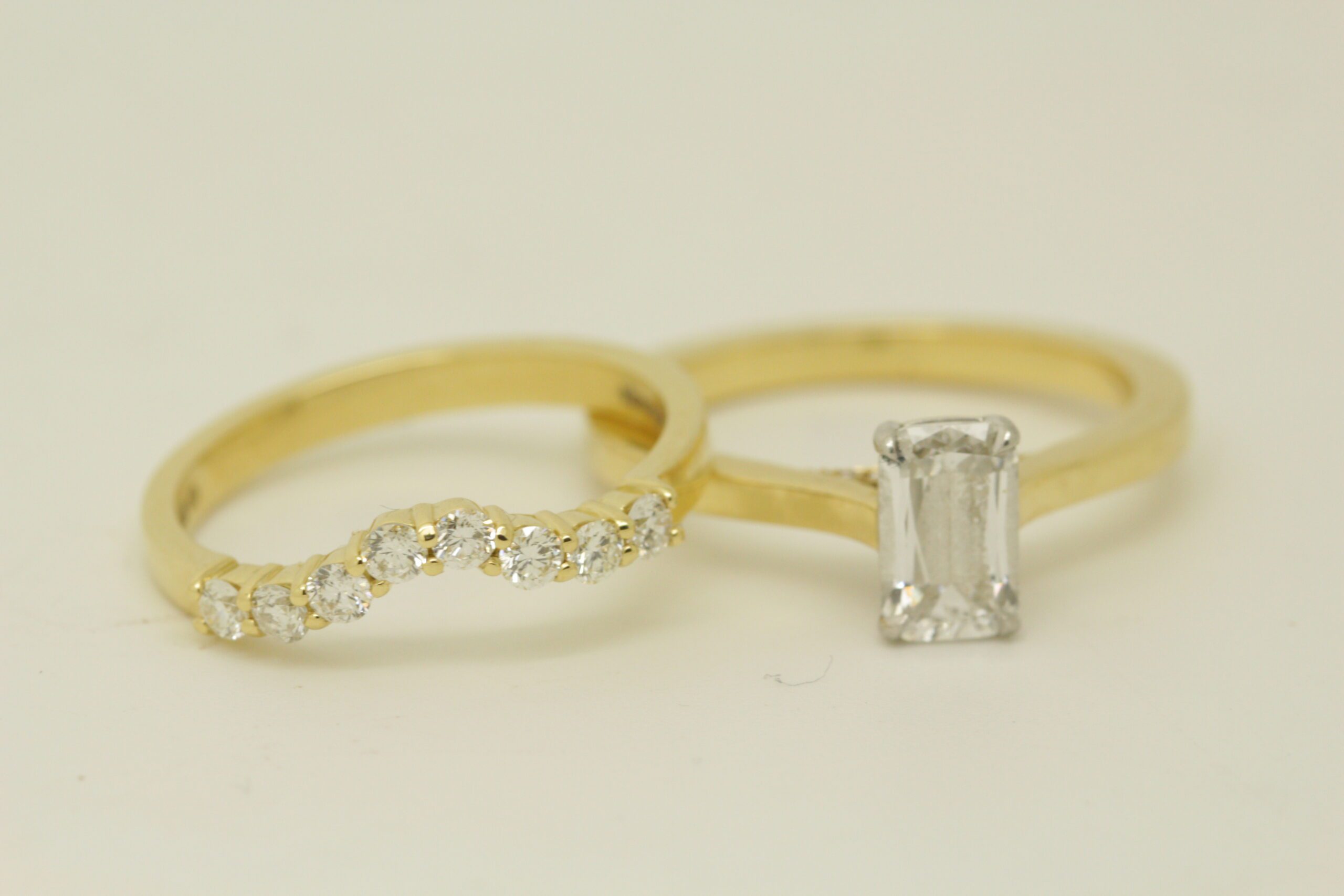 I sourced some diamonds with excellent cut, colour and clarity and after approval I began work at my jewellery bench to forge the gold wedding ring. I had the engagement ring in my possession so I could ensure that the wedding band was made to wrap snugly up against it.